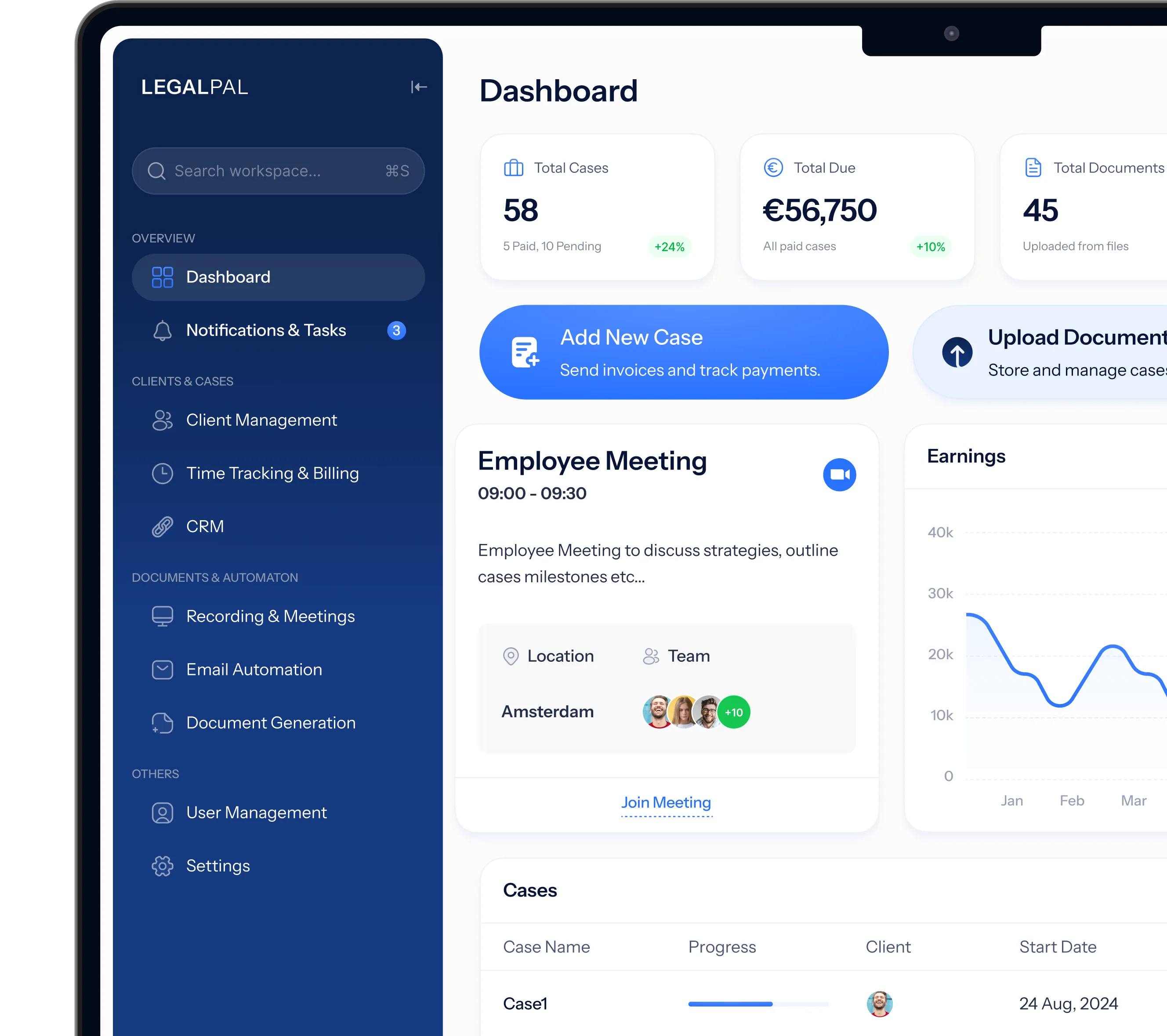 Van gesprek tot verstuurde factuur — LegalPal automatiseert uw hele workflow. AI registreert tijd, genereert juridsiche documenten en koppelt alles direct aan het juiste dossier.